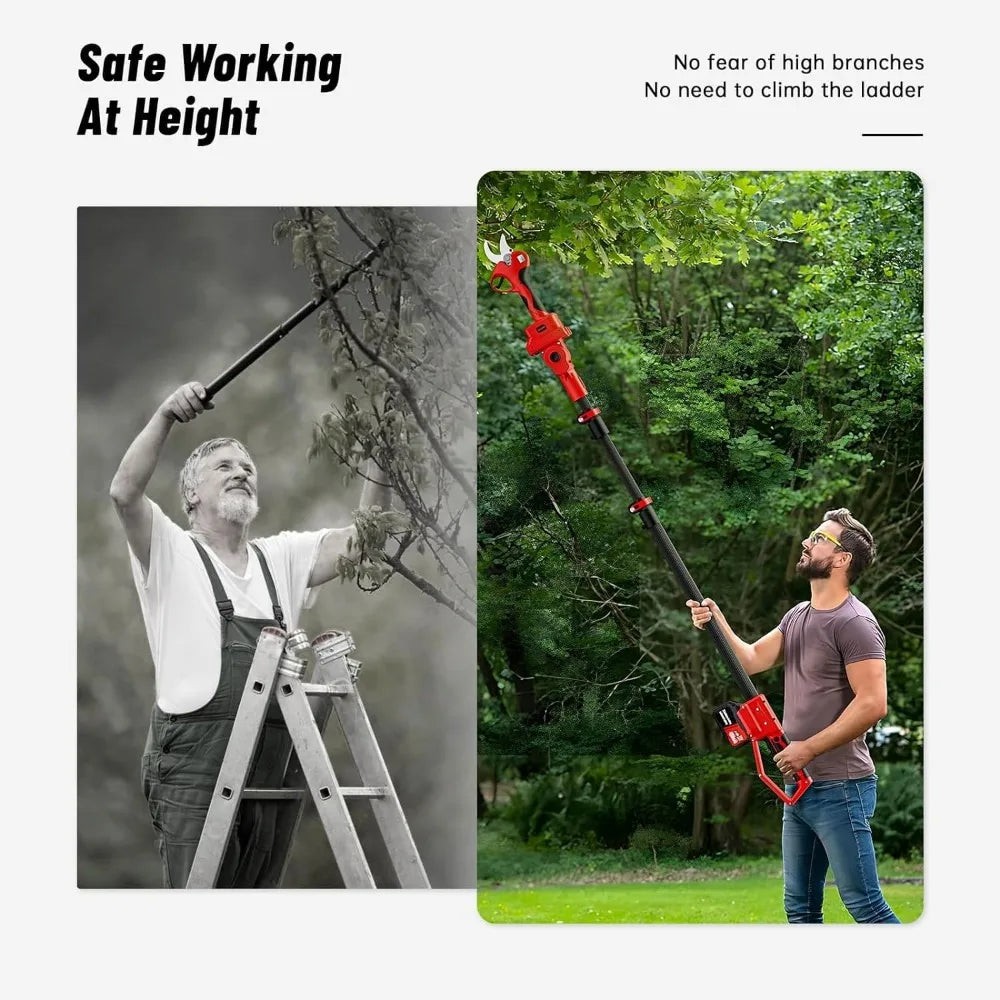 Efficient cutting: The cutting blades of the garden shears are forged from high carbon steel, combined with an arc design, to easily cut 1.2-inch branches without damaging the branches and leaving no slag. Designed with a safety switch, the switch needs to be pressed twice. Get started and avoid unexpected operating errors Ergonomics: The high-definition digital display screen can check the remaining battery power at that time. The lightweight and unique triangular force structure disperses hand pressure. This is also important for people with arthritis. The body is also made of soft rubber, which is shockproof and anti-slip, so you won't feel tired after long-term use. Free Telescopic Extension Pole: The telescopic pole extends from 3.3 feet to 6 feet in height up to 12 feet. Meet your needs for pruning tall branches and help you adjust the pruning distance at any time. Make hard work safer Ultra-long standby: Equipped with 2 21V 2000mAH rechargeable lithium batteries and 2 blades. Each battery lasts about 4-6 hours and only takes 1-2 hours to charge Wide range: suitable for all types of vineyards, green spaces, bushes, gardens, farms, pastures, orchards, greenhouses. You can use it to prune fruit trees such as grape vines, cherry trees, trees, etc. You can also use garden shears to cut plastic, carpet, rubber, rope, and more