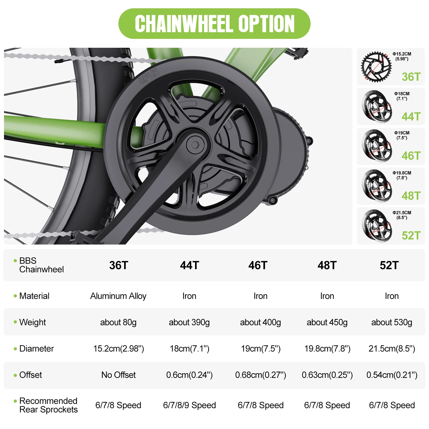 - For the BBSChainwheel, there have 36T 44T 48T 52T for you to choose. .If you would like to change, you could make a note in orders or leave a message for us, then we will change it for free.