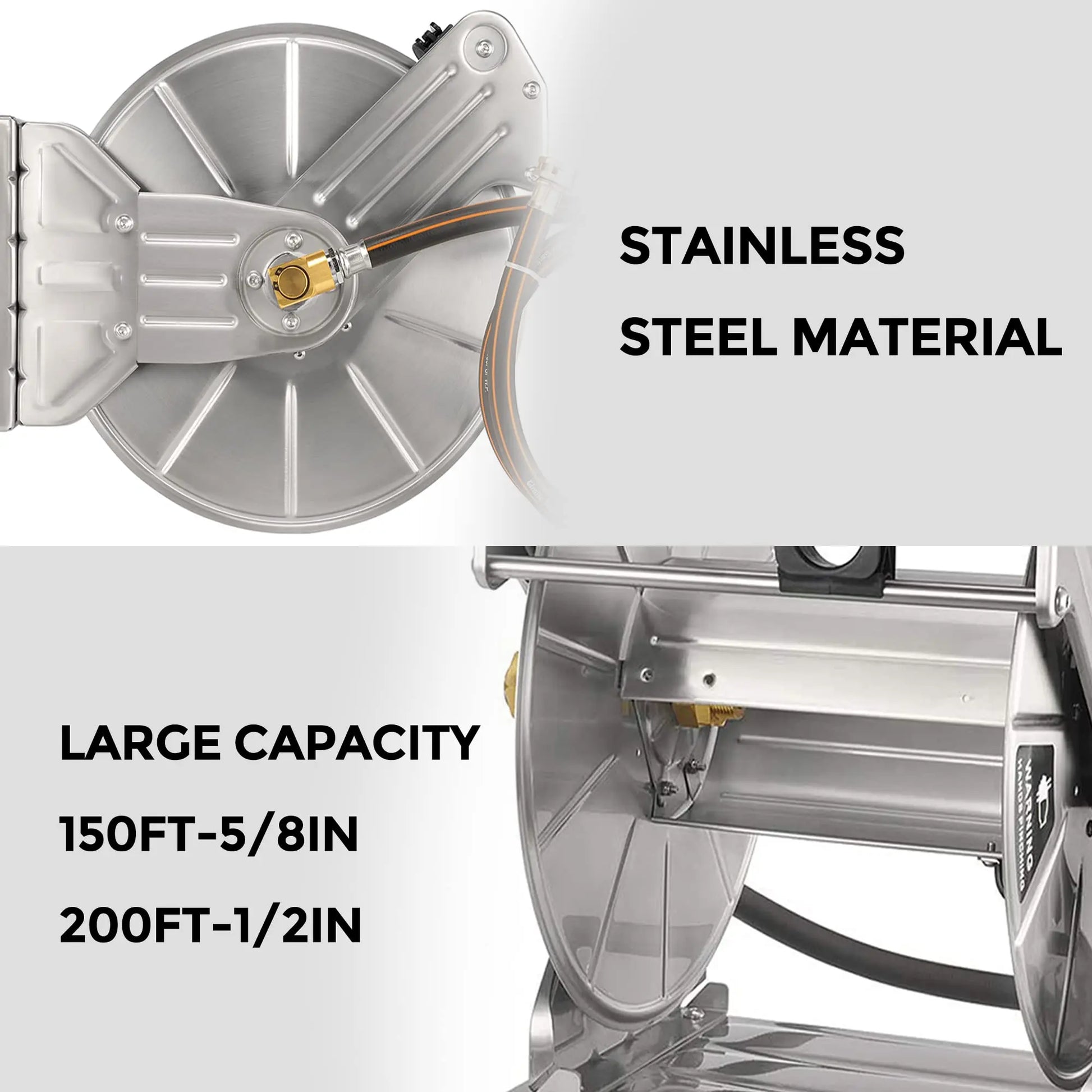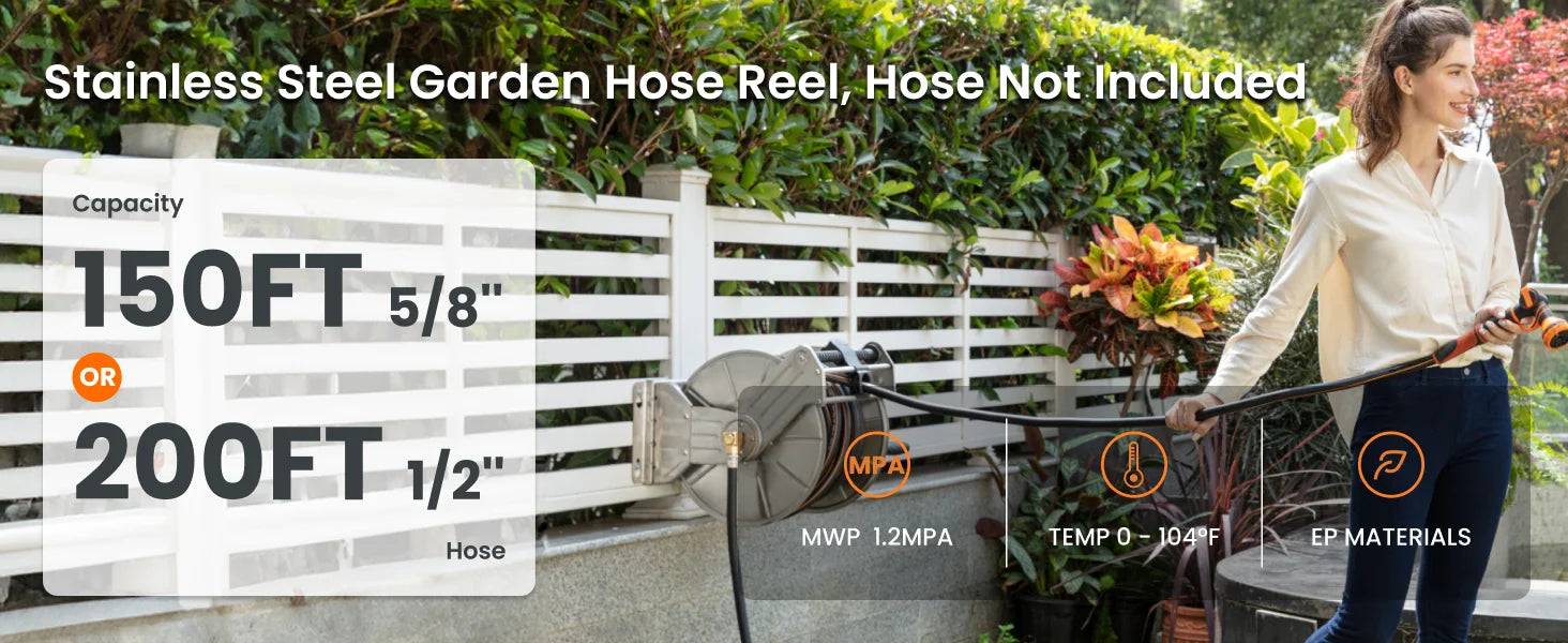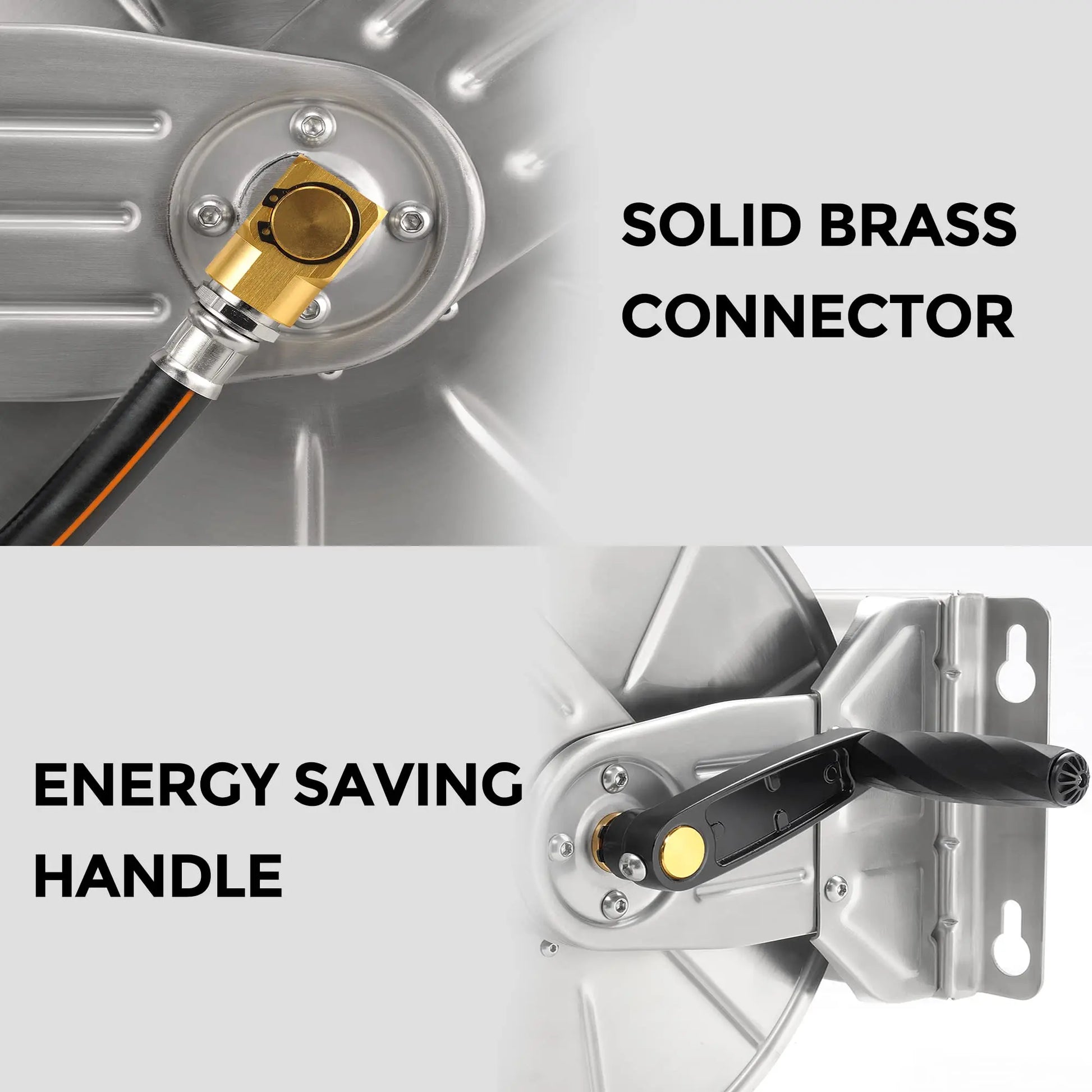 DURABLE CONSTRUCTION - Industrial grade stainless steel makes the hose reel stronger and more durable, corrosion and impact resistant, and the solid brass connector is leak proof and wear resistant for long life.