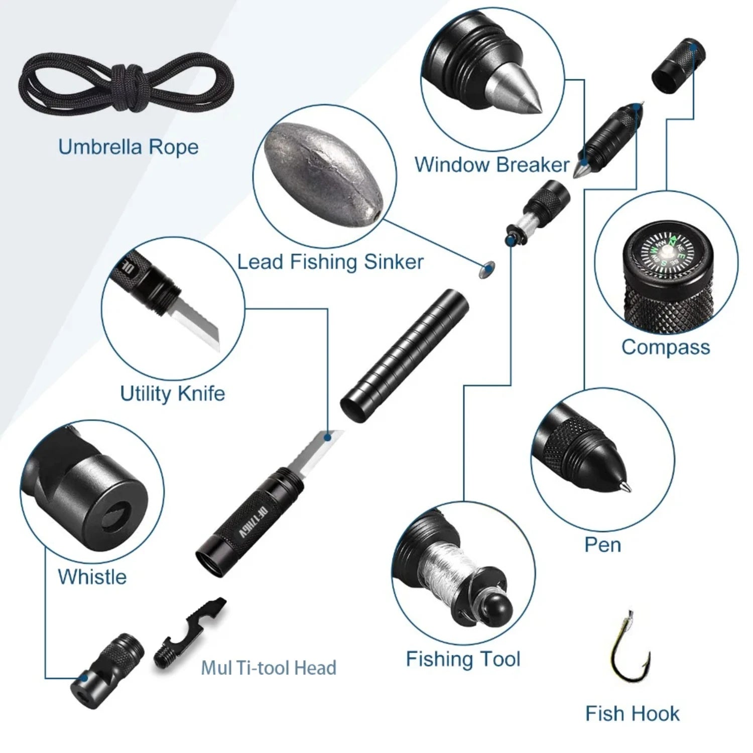 1. This pen includes compass,window breaker,pen,fishing tool,utility ,whistle. The pen made of aviation-grade aluminum excellent strength and portability. Broken windows provide an escape in an emergency.
