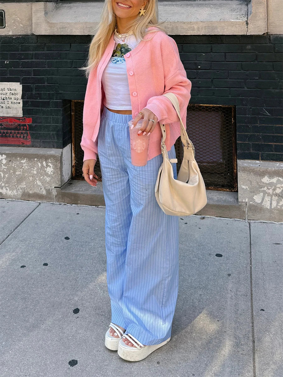 Women's Solid Color Cardigan Long Sleeve Drop Shoulder Crew Neck Button Down Sweater Knit TopsFeatures:
