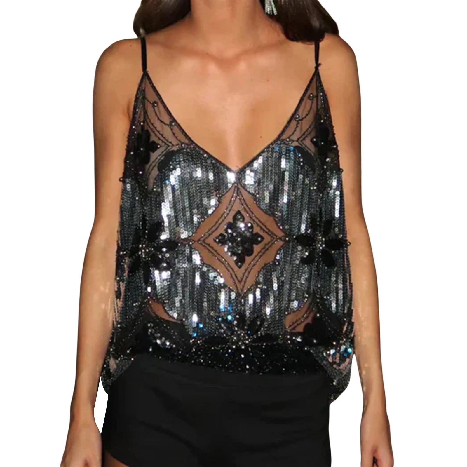 Women s Sparkling Sequin Embellished Crop Top Sleeveless V-Neck Fit Camisole Streetwear Fashion Tank Tops