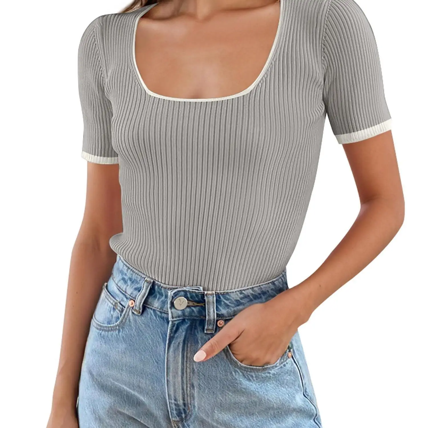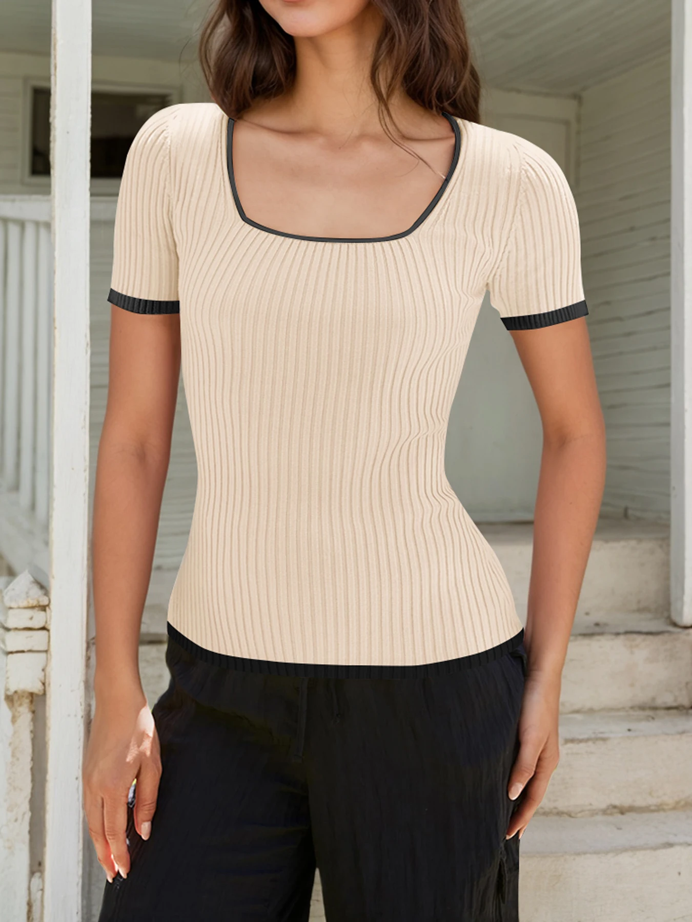 Women's short -sleeved square collar -colored slim tattoos knit knitted basic T -shirt